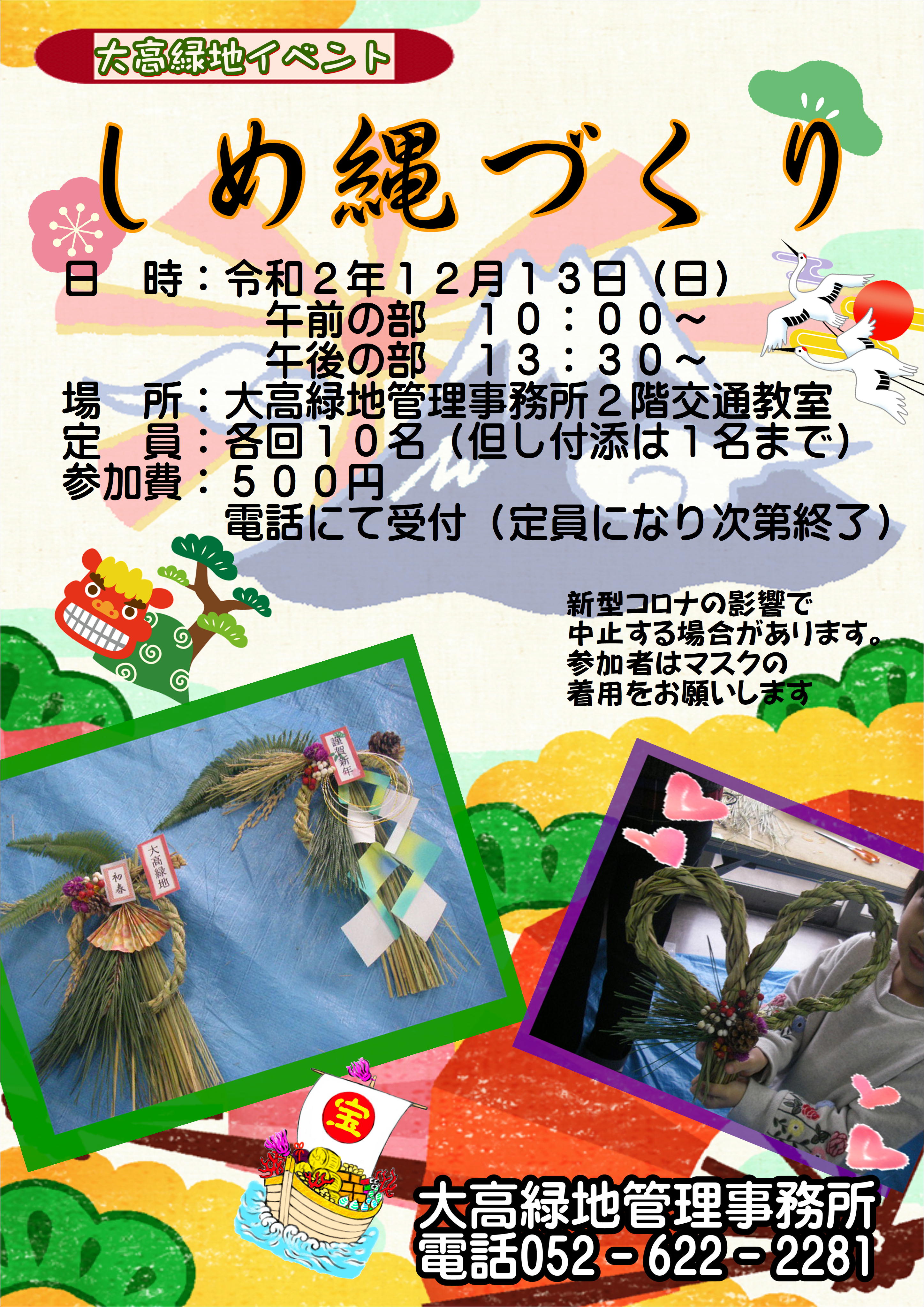 冬の風物詩「しめ縄」 大高緑地で作りませんか。 自分で作ったしめ縄で家内安全を願いましょう。