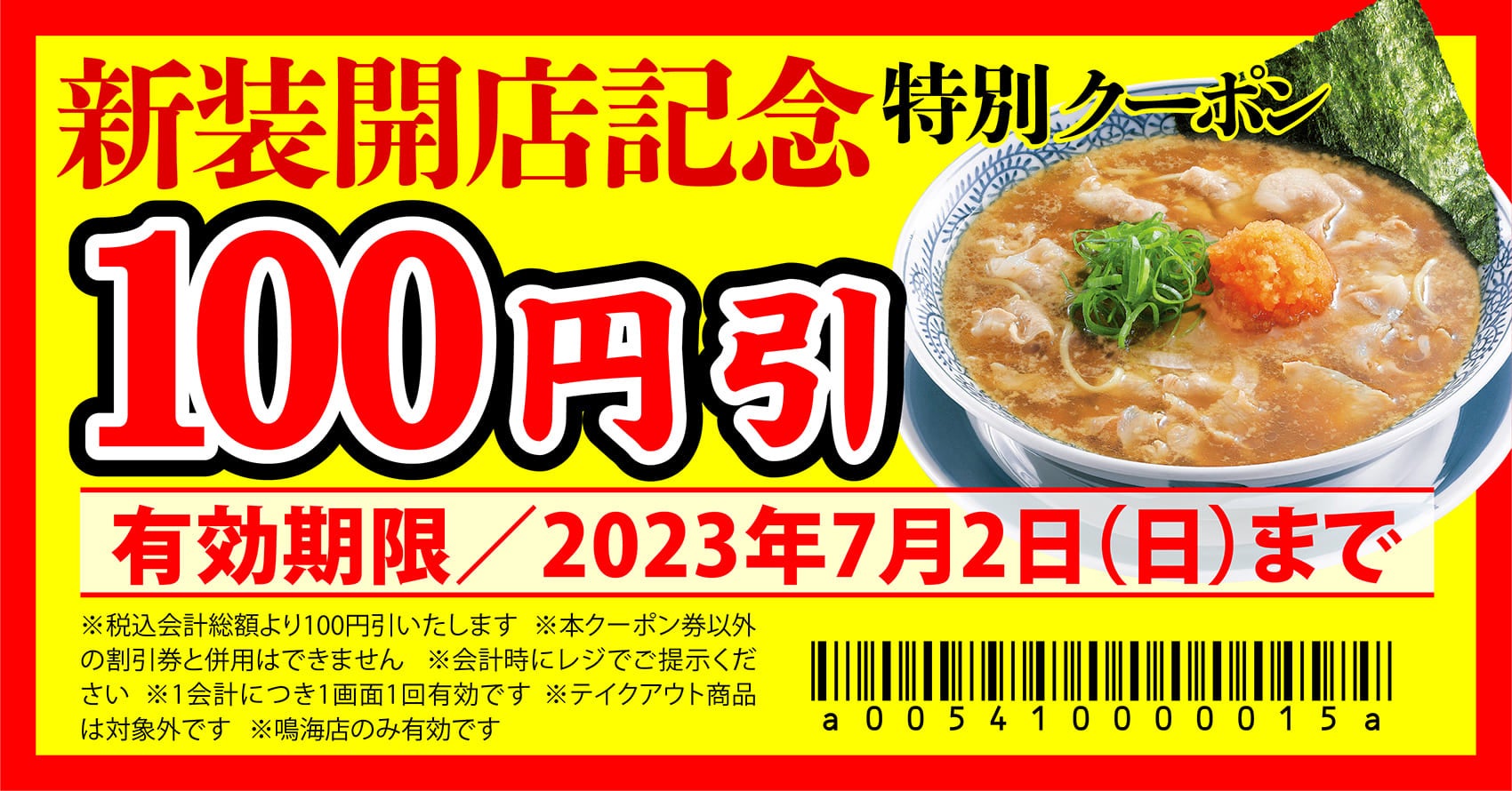 株式会社物語コーポレーション(本社:愛知県豊橋市/代表取締役社長:加藤 央之)が運営する『丸源ラーメン』は、2023年6?21日(水)に、『丸源ラーメン 鳴海店』(愛知県名古屋市)を新装開店いたします。オープン記念として、2023年7月2日(日)まで『丸源ラーメン 鳴海店』のみでご利?いただける100円引クーポンを配布します。