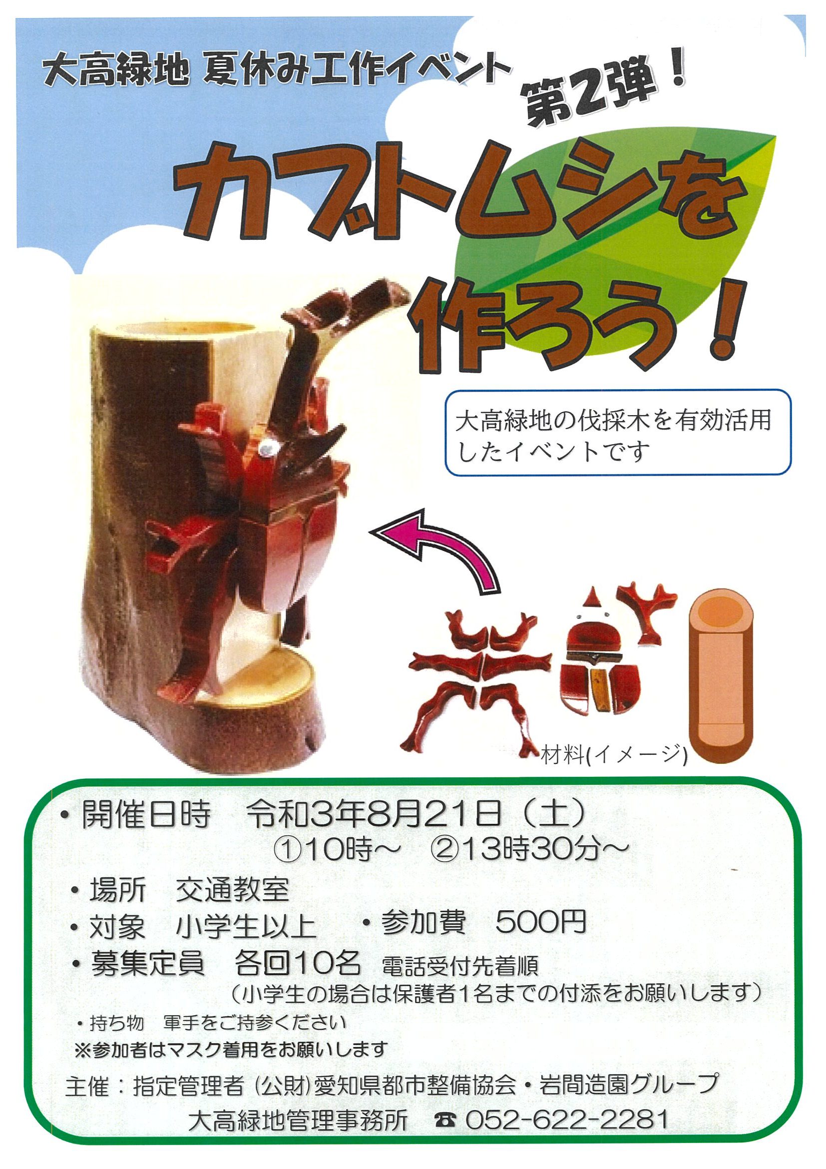 県営大高緑地(大高緑地公園)のホームページで令和5年8月18日(金)と19日の二日間「夏の工作イベント かぶとむしを作ろう!」が開催されるお知らせが発表されました。開催時間は10時と13時30分から。先着順で参加者も募集中。参加費500円が必要です。