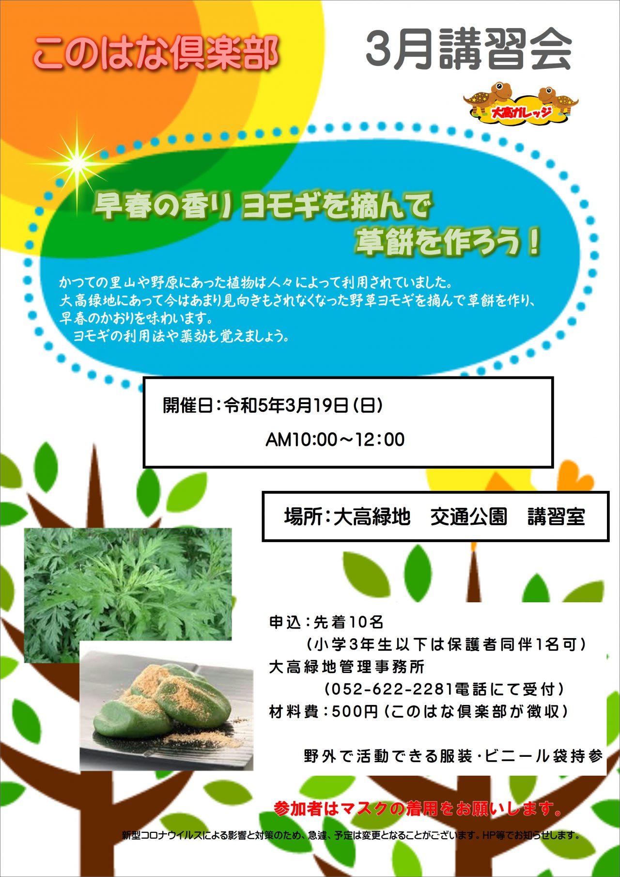 県営大高緑地(大高緑地公園)のホームページで令和6年3月24日(日)に「早春の香り ヨモギを摘んで草餅を作ろう!」が開催されるお知らせが発表されました。開催時間は10時から。先着順で参加者も募集中。参加費500円が必要です。