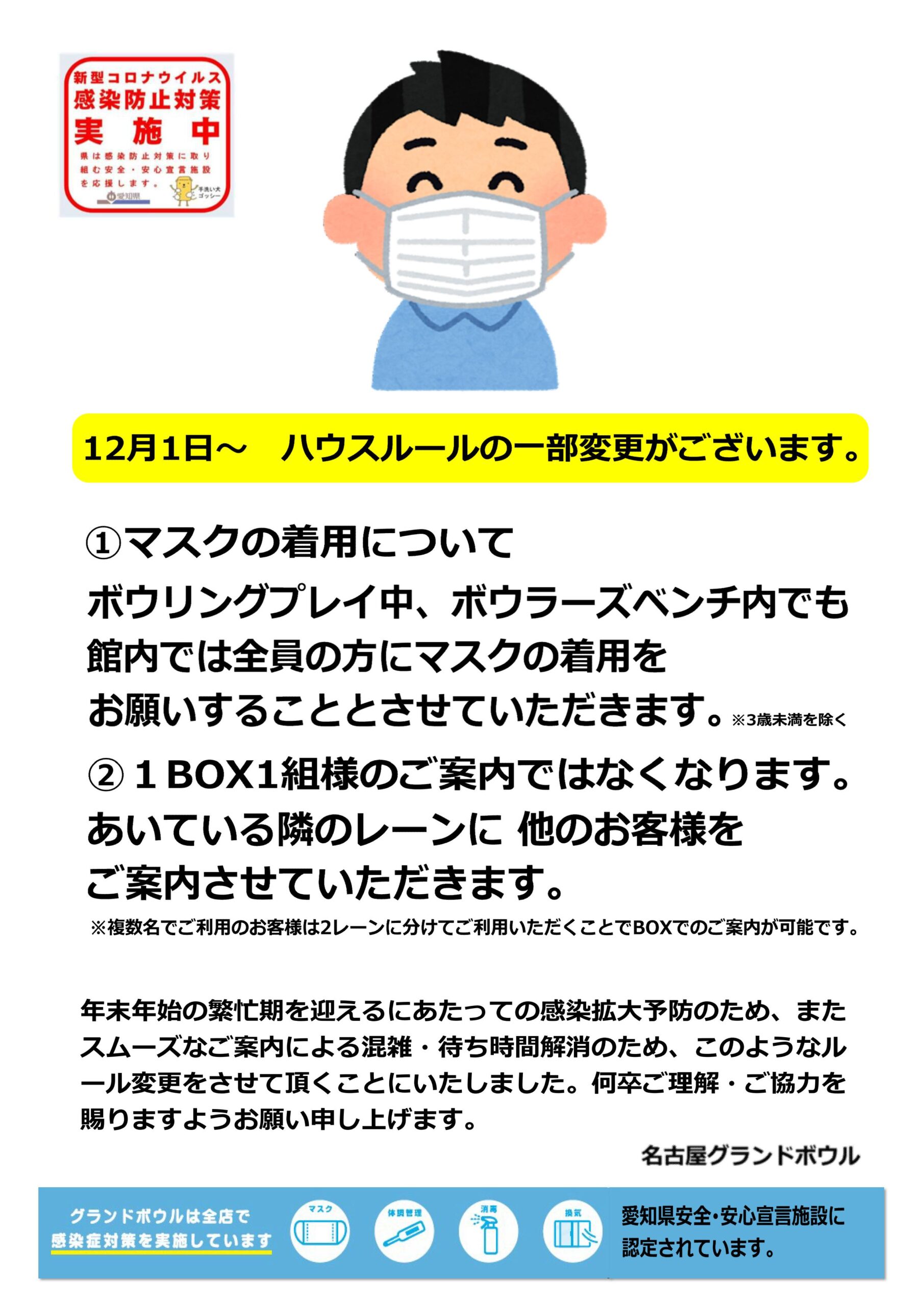 「マスク着用ルール」と「レーンご案内方法」の変更(2021.12.1~)